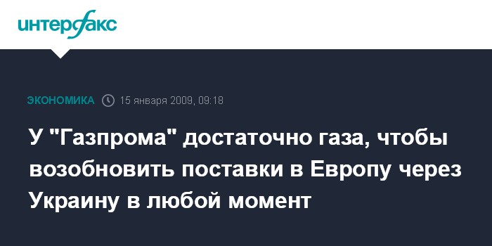 Москва. 15 января. INTERFAX.RU - У "Газпрома" достаточно ресурсов газа для того, чтобы возобновить его поставки в Европу через Украину в любой момент, заявил журналистам официальный представитель ОАО "Газпром" Сергей Куприянов.