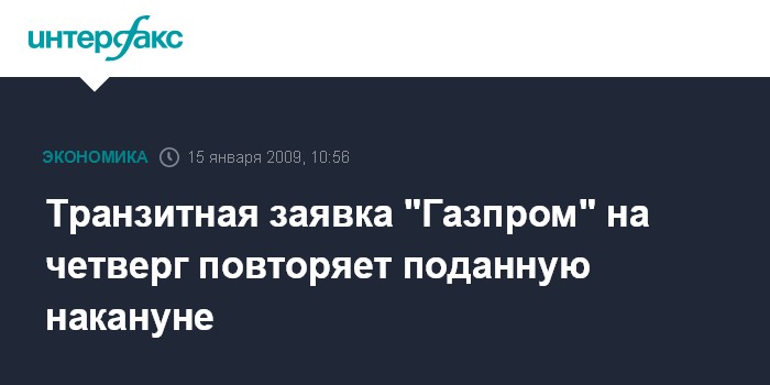 Москва. 15 января. INTERFAX.RU - ОАО "Газпром" подало НАК "Нафторгаз Украины" заявку на транзит 99,2 млн куб. м природного газа в направлении преимущественно газоизмерительной станции (ГИС) "Орловка" и, частично, ГИС "Ужгород", которая повторяет поданную накануне и является такой же нереалистичной для выполнения, сообщили агентству "Интерфакс-Украина" в "Нафтогазе".