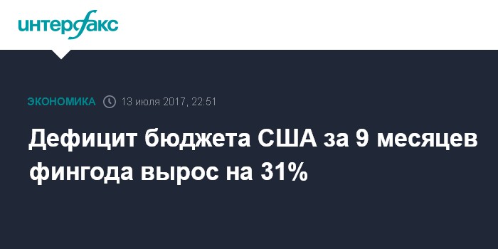 За девять месяцев 2017 финансового года, который начался 1 октября прошлого года, отрицательное сальдо бюджета США выросло на 31% и составило $523,082 млрд по сравнению с $399,161 млрд за сопоставимый период годом ранее.