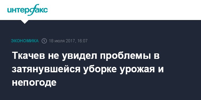 Москва. 18 июля. INTERFAX.RU - Министр сельского хозяйства РФ Александр Ткачев не опасается затянувшихся сроков уборки урожая зерна из-за непогоды.