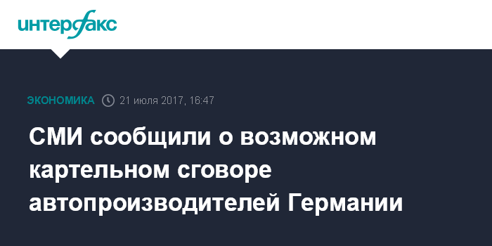 Москва. 21 июля. INTERFAX.RU - Volkswagen AG, Daimler AG и BMW AG, крупнейшие производители автомобилей в Германии, могут быть замешаны в картельном сговоре, начавшемся 20 лет назад, пишет немецкое издание Der Spiegel.