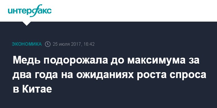 Москва. 25 июля. INTERFAX.RU - Стоимость меди резко поднимается во вторник и может завершить сессию на рекордной отметке за два года на фоне снижения курса доллара и ожидания роста спроса на металлы в Китае. Цена меди подскочила на 2,3% в ходе торгов в Лондоне, до $6165 за тонну. Это максимальная отметка с мая 2015 года.