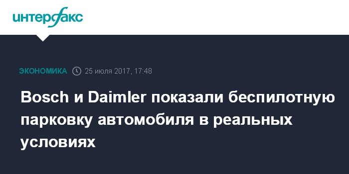Москва. 25 июля. INTERFAX.RU - Германские компании Bosch и Daimler продемонстрировали беспилотную парковку автомобиля в реальных условиях в паркинге музея Mercedes-Benz в Штутгарте. Как сообщается в пресс-релизе Bosch, теперь с помощью смартфона водитель может автоматически припарковать машину в нужном месте, не отслеживая при этом его передвижение.