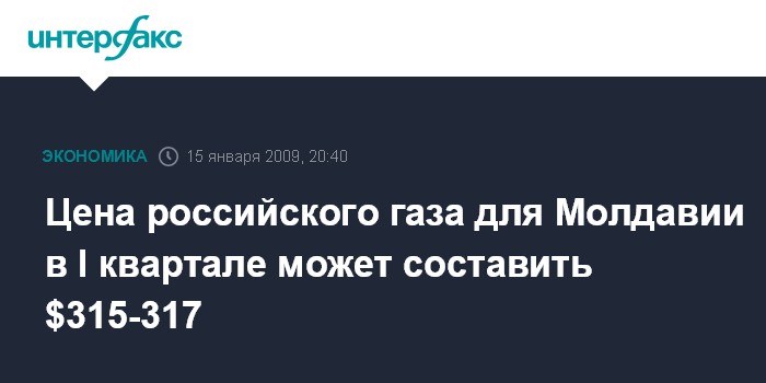 Кишинев. 15 января. INTERFAX.RU - Стоимость российского газа для Молдавии в первом квартале 2009 года может составить $315-317 за тысячу кубометров, сообщил первый вице-премьер, министр экономики и торговли Игорь Додон журналистам в четверг после заседания правительства.