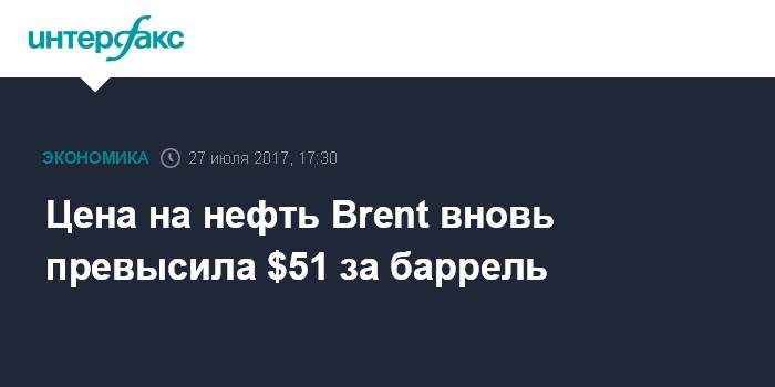 Москва. 27 июля. INTERFAX.RU - Нефть эталонных марок перешла от снижения к росту в ходе торгов в четверг и торгуется на максимальном уровне с начала июня. Цена сентябрьских фьючерсов на нефть Brent на лондонской бирже ICE Futures к 17:16 МСК увеличилась на $0,17 (0,33%) - до $51,14 за баррель.