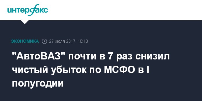 Москва. 27 июля. INTERFAX.RU - "АвтоВАЗ" почти в 7 раз снизил чистый убыток по МСФО в I полугодии 2017 года по отношении к аналогичному периоду прошлого года, до 4 млрд рублей, сообщила компания.