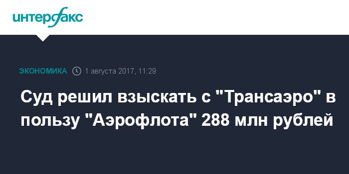 Москва. 1 августа. INTERFAX.RU - Арбитражный суд Москвы во вторник решил взыскать с авиакомпании "Трансаэро" в пользу "Аэрофлота" около 288 млн рублей из ранее заявленных "Аэрофлотом" 2,2 млрд рублей, передал корреспондент "Интерфакса" из суда. На заседании представитель "Аэрофлота" снизил сумму взыскания до 289 млн рублей с учетом позиции Верховного суда по аналогичному делу.