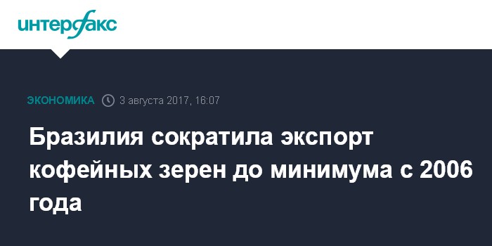 Москва. 3 августа. INTERFAX.RU - Бразильские фермеры не спешат расставаться с урожаем кофе после падения цен на 20% с прошлогоднего пика, в результате экспорт необжаренных зерен в июле сократился до минимума за все время сбора данных - с 2006 года, пишет профильное издание Noticias Agricolas.