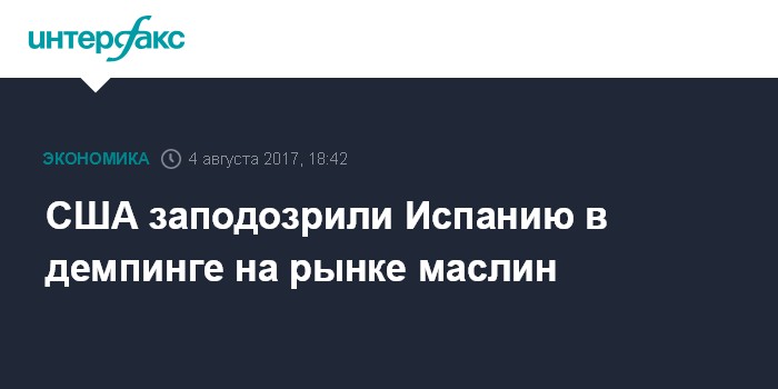 Москва. 4 августа. INTERFAX.RU - Министерство торговли США проводит расследование в отношении импорта маслин из Испании в связи жалобой Американской коалиции за справедливую торговлю зрелыми оливками на то, что зарубежные конкуренты поставляют свою продукцию по цене ниже обоснованной.