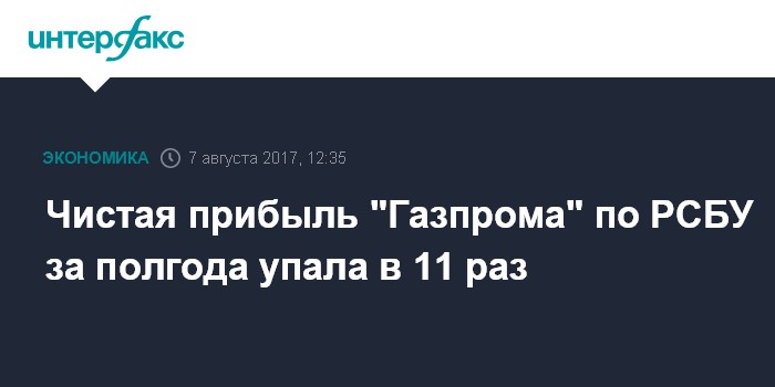 Москва. 7 августа. INTERFAX.RU - Чистая прибыль головной компании ПАО "Газпром" по российским стандартам бухучета (РСБУ) за первое полугодие 2017 года скатилась почти до нуля - 17,4 млрд рублей - со 194,417 млрд рублей за январь-июнь 2016 года. Об этом свидетельствуют расчеты "Интерфакса" на основе материалов "Газпрома".