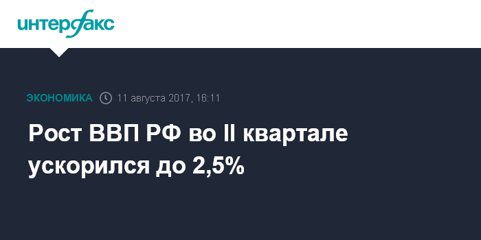 Москва. 11 августа. INTERFAX.RU - ВВП РФ во II квартале 2017 года ускорился до 2,5% в годовом сравнении после роста на 0,5% в I квартале. Такую первую оценку распространила в пятницу Федеральная служба государственной статистики.