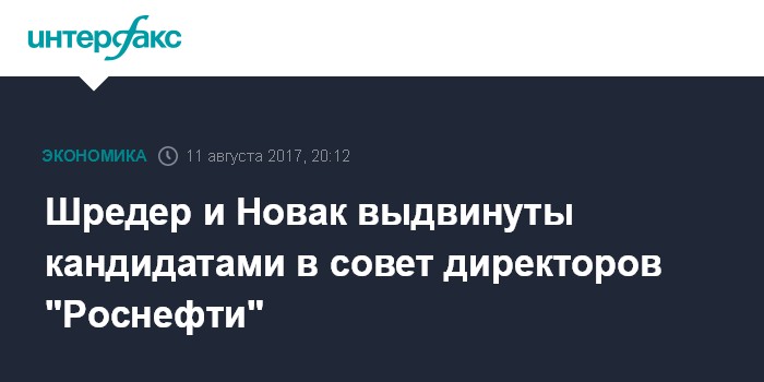 Москва. 11 августа. INTERFAX.RU - Правительство РФ утвердило кандидатами для избрания в совет директоров "Роснефти" семь кандидатов, в числе которых министр энергетики РФ Александр Новак и экс-канцлер Германии Герхард Шредер, говорится в распоряжении правительства.