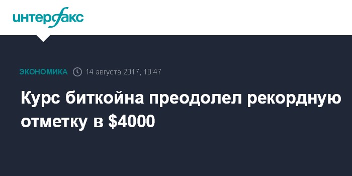 Москва. 14 августа. INTERFAX.RU - Курс биткойна продолжает стремительный подъем: в минувшее воскресенье он впервые превысил отметку в $4000.