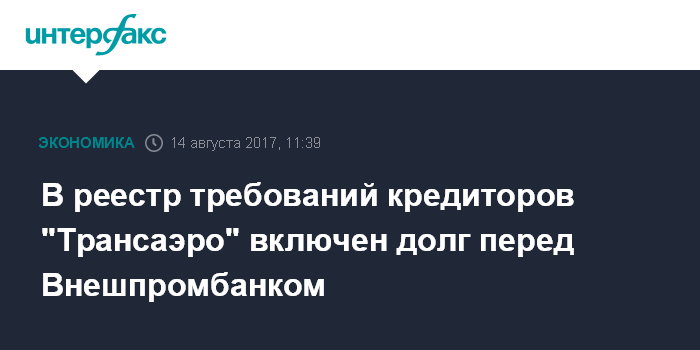 В реестр требований кредиторов "Трансаэро" включен долг перед Внешпромбанком