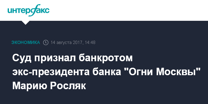 Москва. 14 августа. INTERFAX.RU - Московский арбитражный суд в понедельник по заявлению банка "Развитие-Столица" признал несостоятельной (банкротом) экс-президента банка "Огни Москвы", дочь бывшего вице-мэра Москвы Марию Росляк, передал корреспондент "Интерфакса" из суда.