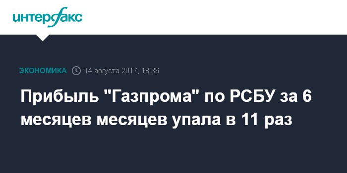 Москва. 14 августа. INTERFAX.RU - Чистая прибыль головной компании ПАО "Газпром" по российским стандартам (РСБУ) за первое полугодие 2017 года скатилась почти до нуля - 17,376 млрд рублей - со 194,417 млрд рублей за январь-июнь 2016 года, свидетельствуют данные ежеквартального отчета. Результат из отчета точно совпал с опубликованными неделей ранее расчетами "Интерфакса".
