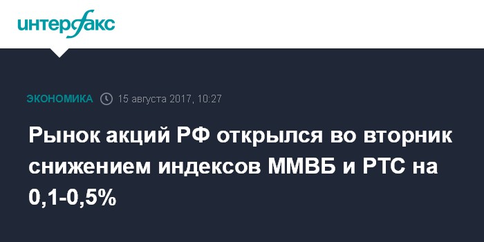 Москва. 15 августа. INTERFAX.RU - Рынок акций РФ открылся во вторник снижением цен большинства blue chips на фоне заметно упавшей накануне нефти, некоторую поддержку рынку оказывает благоприятная конъюнктура мировых фондовых рынков из-за снижения накала геополитической напряженности вокруг Северной Кореи; индексы ММВБ и РТС за первую минуту торгов снизились на 0,1-0,5%.