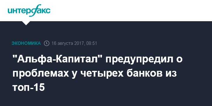 Москва. 16 августа. INTERFAX.RU - Управляющая компания "Альфа-Капитал" направила своим клиентам письмо, в котором предупредила о возможных проблемах у четырех российских банков, входящих в топ-15 по стране: ФК "Открытие", Бинбанка, Промсвязьбанка и Московского кредитного банка (МКБ), сообщает в среду газета "Ведомости" со ссылкой на текст этого письма.