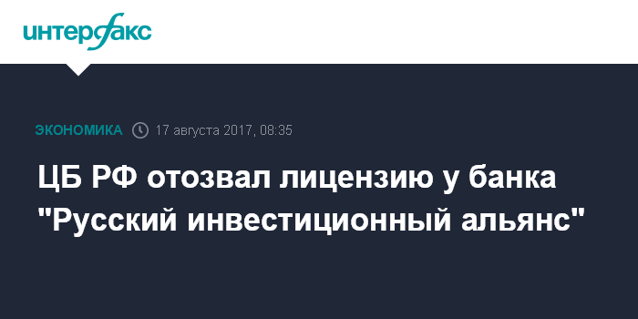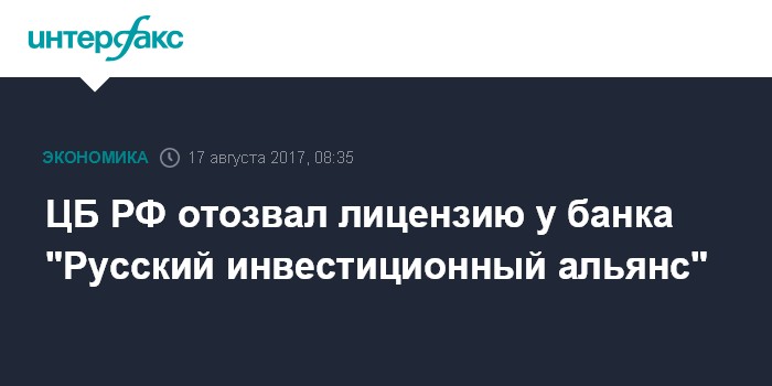 Москва. 17 августа. INTERFAX.RU - Банк России отозвал лицензию на осуществление банковских операций у банка "Русский инвестиционный альянс" (РИАБанк), говорится в сообщении ЦБ.