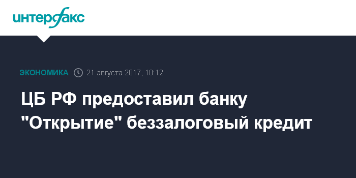 Москва. 21 августа. INTERFAX.RU - Центробанк РФ предоставил банку "Открытие" беззалоговый кредит. Об этом пишет газета "Ведомости " со ссылкой на два источника.