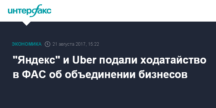 Москва. 21 августа. INTERFAX.RU - "Яндекс" и Uber подали ходатайство Федеральную антимонопольную службу об объединении бизнесов онлайн-заказа такси, говорится в сообщении службы.