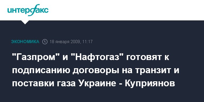 "В соответствии с договоренностями, которые были достигнуты вчера ночью главами правительств России и Украины, в настоящее время "Газпром" и "Нафтагаз" готовят к подписанию договоры на поставку газа для потребителей Украины и соответствующее соглашение, касающееся транзита газа", - отметил С.Куприянов.