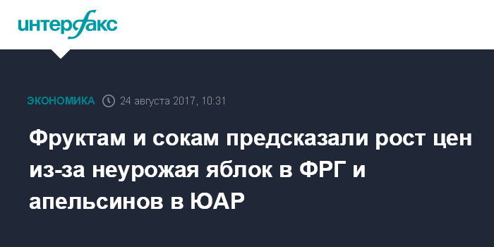 Москва. 24 августа. INTERFAX.RU - Неурожаи яблок в Германии и апельсинов в ЮАР вызовут рост цен в мире, пишет Deutsche Welle. Эксперты полагают, что фермеры ФРГ соберут в этом сезоне в лучшем случае 555 тыс. тонн яблок, что составляет менее половины от прошлогоднего урожая. Такой показатель станет худшим более чем за четверть века - с 1991 года.