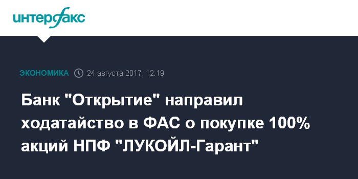 Банк "Открытие" направил ходатайство в ФАС о покупке 100% акций НПФ "ЛУКОЙЛ-Гарант"