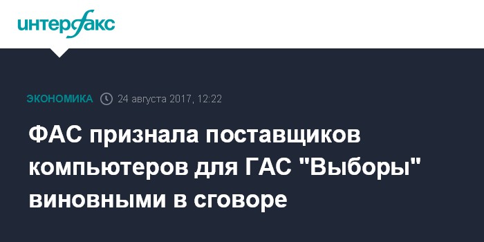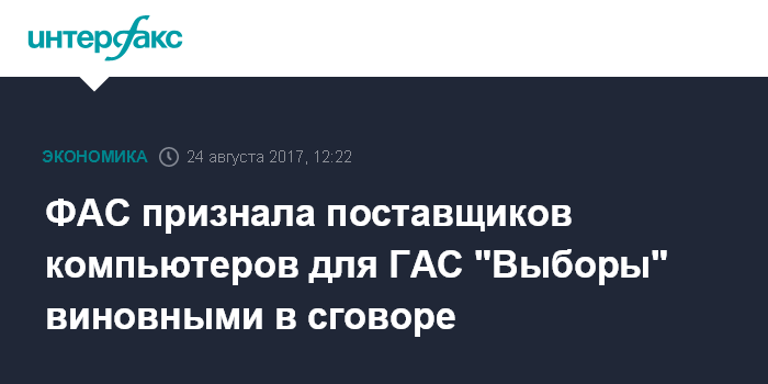 Москва. 24 августа. INTERFAX.RU - Федеральная антимонопольная служба признала поставщиков компьютерной техники для ГАС "Выборы" виновными в картельном сговоре, за нарушения им грозят оборотные штрафы.
