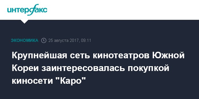 Москва. 25 августа. INTERFAX.RU - Крупнейшая сеть кинотеатров Южной Кореи CJ CGV интересуется покупкой российской киносети "Каро", сообщает в пятницу газета "Коммерсантъ" со ссылкой на источники.