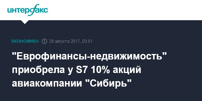 Москва. 29 августа. INTERFAX.RU - ООО "Еврофинансы-недвижимость" купила у ЗАО "Группа компания С 7" 10,05% акций ПАО "Авиакомпания "Сибирь" за 533,4 млн рублей, говорится в сообщениях компаний.