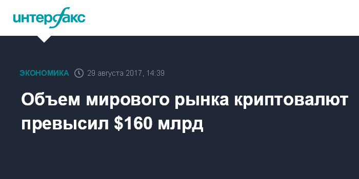 Москва. 29 августа. INTERFAX.RU - Стоимость всех имеющихся в обращении электронных валют мира в понедельник выросла до рекордных $160 млрд благодаря росту курсов биткойна и эфира, пишет MarketWatch со ссылкой на данные сайта Coinmarketcap.