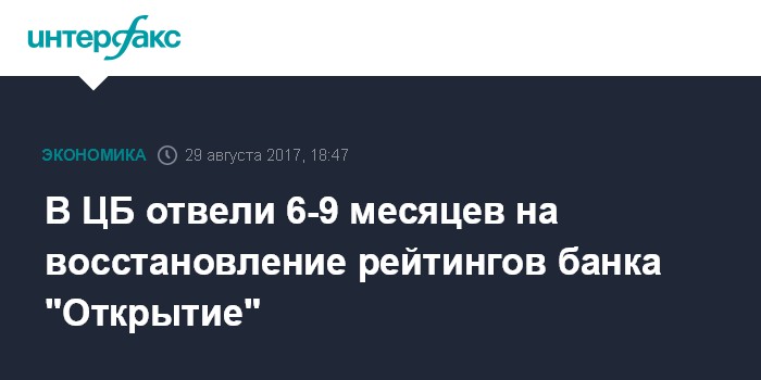 Москва. 29 августа. INTERFAX.RU - ЦБ рассчитывает на восстановление рейтинга банка "Открытие" за 6-9 месяцев, сообщил первый зампред ЦБ РФ Дмитрий Тулин журналистам во вторник.