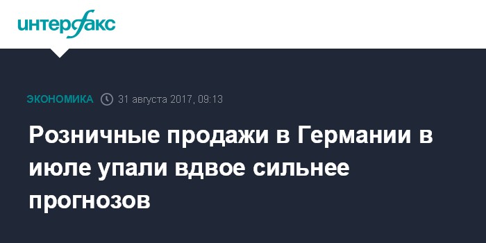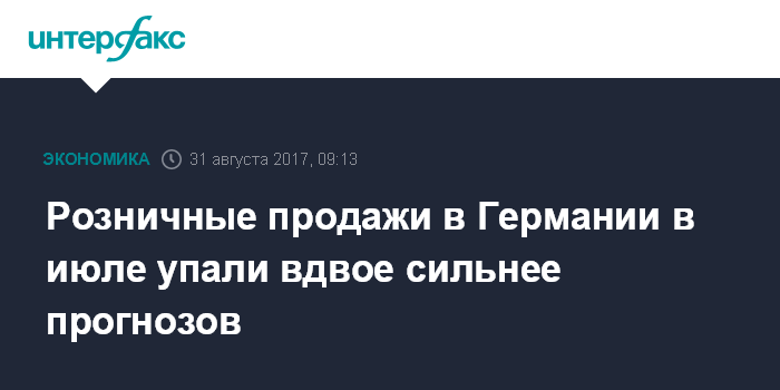 Москва. 31 августа. INTERFAX.RU - Розничные продажи в Германии в июле 2017 года уменьшились на 1,2% относительно предыдущего месяца, свидетельствуют данные Федерального статистического агентства страны.