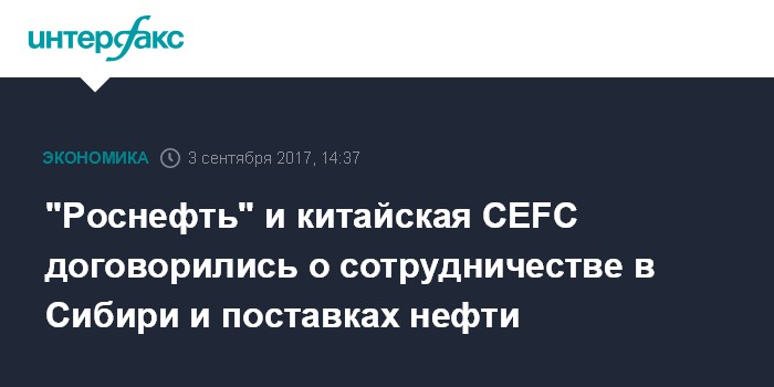 Москва. 3 сентября. INTERFAX.RU - ПАО "НК "Роснефть" и китайская энергетическая компания "Хуасинь" China Energy Company Limited (CEFC) подписали соглашение о стратегическом сотрудничестве и долгосрочный контракт на поставку нефти, говорится в сообщении российской компании.