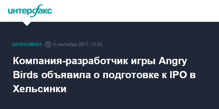 Москва. 5 сентября. INTERFAX.RU - Финская компания Rovio Entertainment, разработчик популярной игры Angry Birds, объявила о намерении провести IPO. Запланированная сделка предусматривает размещение акций держателем крупнейшей доли в компании - Trema International Holdings B.V., а также рядом других акционеров, говорится в сообщении Rovio.