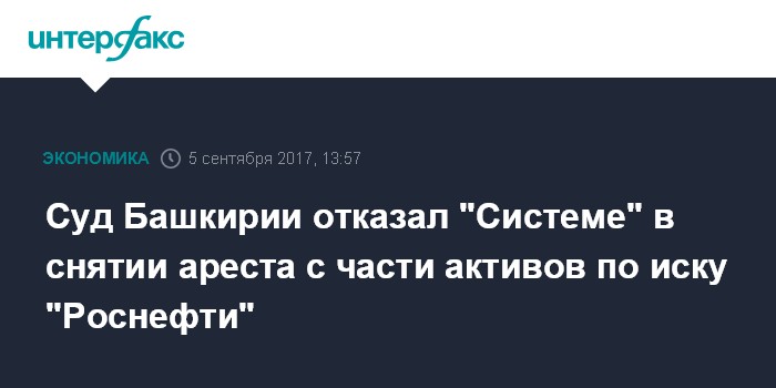 Москва. 5 сентября. INTERFAX.RU - Арбитражный суд Башкирии во вторник отказал АФК "Система" , ходатайствовавшей об отмене обеспечительных мер по иску "Роснефти" и "Башнефти" к холдингу Владимира Евтушенкова, передает корреспондент "Интерфакса" с заседания суда.