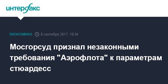Москва. 6 сентября. INTERFAX.RU - Мосгорсуд отменил требование авиакомпании "Аэрофлот" к внешнему виду и возрасту стюардесс, сообщили "Интерфаксу" в среду в пресс-службе суда.