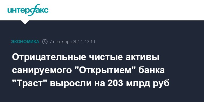 Москва. 7 сентября. INTERFAX.RU - Отрицательный капитал банка "Траст", который санируется группой "Открытие", за август увеличился почти на 203 млрд рублей, составив на 1 сентября минус 317 млрд рублей, свидетельствует информация Единого федерального реестра сведений о фактах деятельности юридических лиц (Федресурс).