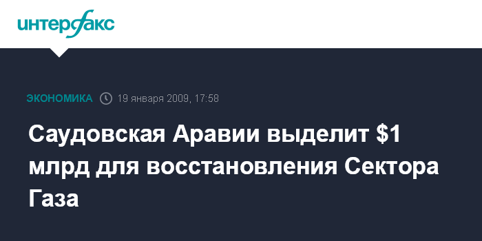 Эль-Кувейт. 19 января. INTERFAX.RU - Король Саудовской Аравии Абдалла заявил в понедельник о выделении финансовой помощи в размере $1 млрд на восстановление Cектора Газа, сообщает агентство ЭФЭ. Король заявил об этом на экономическом саммите арабских стран в столице Кувейта.