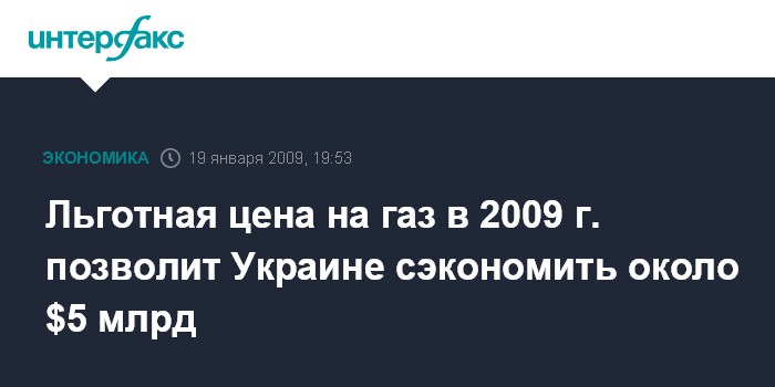 Москва. 19 января. INTERFAX.RU - Премьер-министр Юлия Тимошенко заявляет, что льготная цена на российский газ для Украины в 2009 г. позволит стране сэкономить около $5 млрд.