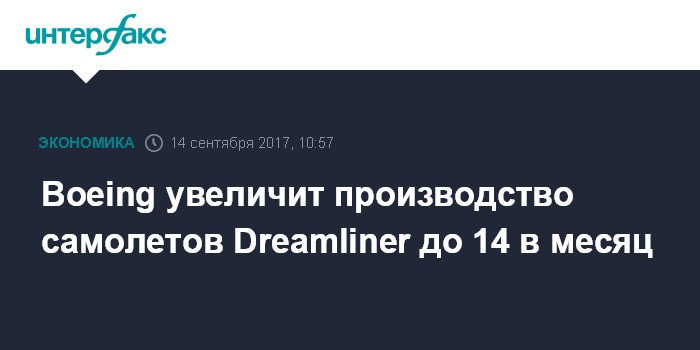 Москва. 14 сентября. INTERFAX.RU - Американский самолетостроительный концерн Boeing намерен увеличить производство самолетов модели 787 Dreamliner в 2019 году до 14 в месяц по сравнению с 12 в месяц в настоящее время, говорится в пресс-релизе компании.