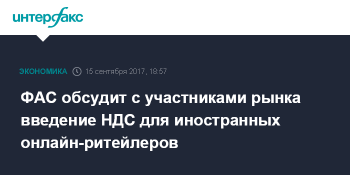 Москва. 15 сентября. INTERFAX.RU - Федеральная антимонопольная служба (ФАС) РФ планирует 2 октября провести заседание рабочей группы по вопросу введения НДС в отношении иностранных интернет ритейлеров - AliExpress, Amazon, eBay и других.