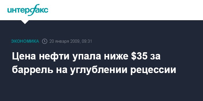 Москва. 20 января. INTERFAX.RU - Стоимость нефти упала ниже $35 за баррель на углублении рецессии мировой экономики, сообщило агентство Bloomberg.