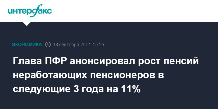 Москва. 18 сентября. INTERFAX.RU - Рост пенсий неработающих пенсионеров составит 11% за период с 2018 по 2020 годы, заявил глава Пенсионного фонда РФ Антон Дроздов, озвучивая проект федерального закона "О бюджете Пенсионного фонда РФ на 2018 год и на плановый период 2019 и 2020 годов" на заседании российской трехсторонней комиссии по регулированию социально-трудовых отношений.