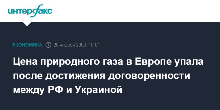 Москва. 20 января. INTERFAX.RU - Цена природного газа в Европе упала в понедельник после подписания газового соглашения между Россией и Украиной, что открыло путь для возобновления поставок в Европу после двухнедельного перерыва, сообщило агентство Bloomberg.