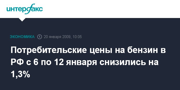 Москва. 20 января. INTERFAX.RU - Потребительские цены на автомобильный бензин в среднем по России с 6 по 12 января снизились на 1,3%, сообщила Федеральная служба государственной статистики РФ (Росстат).