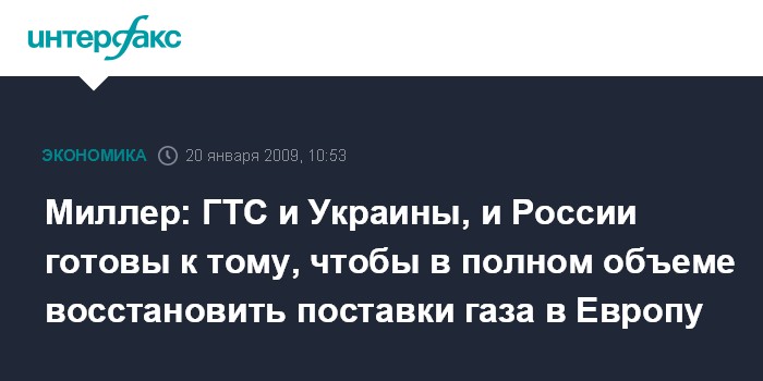 "С нашей стороны труба находится под давлением с 13 января", - напомнил Миллер. "С того времени "Газпром" готов начать поставки газа европейским потребителям", - заявил он. "На 10:15 мск можно констатировать, что ГТС и Украины, и России готовы к тому, чтобы в полном объеме восстановить поставки", - подтвердил А.Миллер.