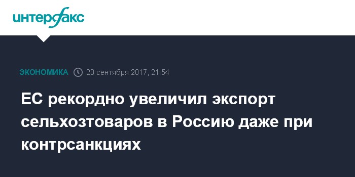 Москва. 20 сентября. INTERFAX.RU - Еврокомиссия сообщила о рекордном росте экспорта из ЕС в Россию сельскохозяйственной продукции за счет продажи товаров, не затронутых российскими контрсанкциями.