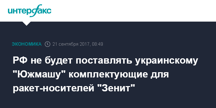Москва. 21 сентября. INTERFAX.RU - Россия не станет поставлять украинскому "Южмашу" комплектующие для ракет-носителей "Зенит", которые предполагается использовать в программе "Морской старт".